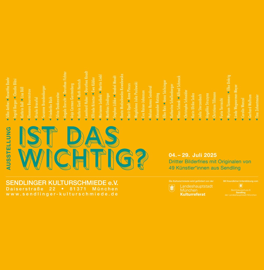 Vom 4. bis 29. Juli 2025 findet in der Sendlinger Kulturschmiede die dritte Ausstellung des Sendlinger Bilderfries statt. Unter dem Titel „Ist das wichtig?“ setzen sich 49 Künstler:innen in einer vielfältigen Gemeinschaftsausstellung mit zentralen Fragen des Lebens auseinander: Was ist wirklich wichtig? Was brauchen wir – und was nicht? Auch die Bedeutung der Kunst selbst wird hinterfragt: Ist sie notwendig, bereichernd oder vielleicht sogar herausfordernd? Die ausgestellten Werke spiegeln diese individuellen und gesellschaftlichen Kernfragen in unterschiedlichsten künstlerischen Ausdrucksformen wider.